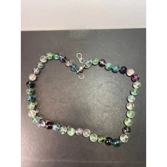 Genuine fluorite 9 mm beads knotted in between. 18 inch length with chain extension adding another 6 more inches. Clasp is magnetic. Clasp and chain slides are rhodium plated over sterling silver. 925