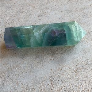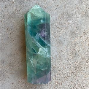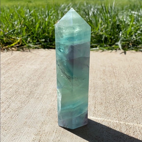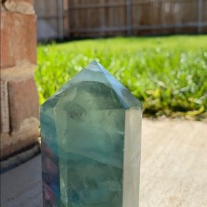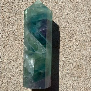 Rainbow fluorite natural stone carved and polished into a self standing point. Pictures taken outside in natural light. About 5” tall