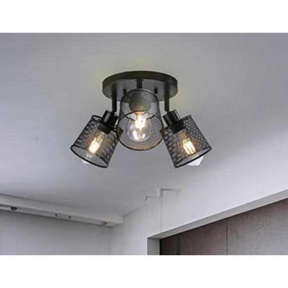 Newrays 3-Light Industrial Vintage Iron Metal Mesh Ceiling Light, Black Flush Mount Ceiling Light Fixture for Hallway, Kitchen, Bedroom, Office