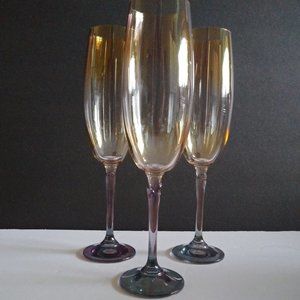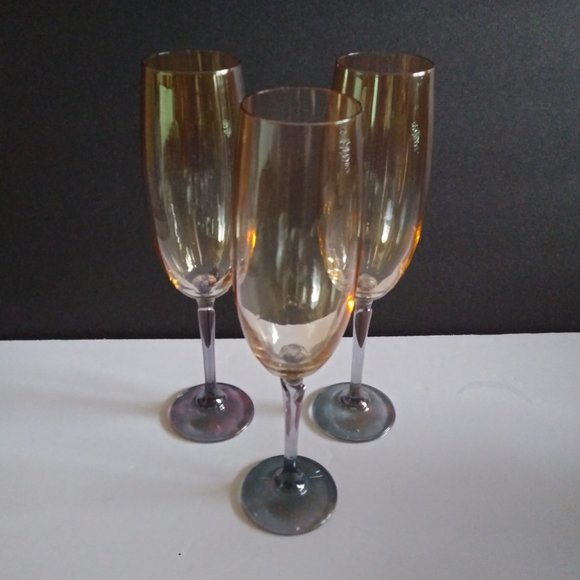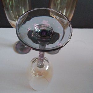 These glasses are from the 90's I believe. They have lovely lotus stems. Luster Iridescent glass reminiscent of the Carnival glass Days. Each color fading into the next. They are Gray, Purple and Peach/Amber Color but are they? Iridescent, they change color depending on time of day and light in the room. I took night time and day time pictures and they still aren't exactly representative. Very unique and entertaining. Cheers!