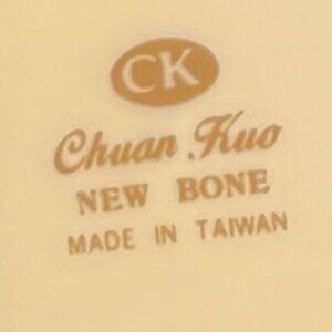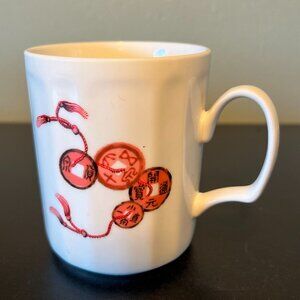 New bone china off-white teacup features an attractive fluted surface with a rose colored graphic of a string of old Chinese coins on one side and decorative Chinese calligraphy on the other. Stylish and comfortable handle. Made in Taiwan by Chuan Kuo Ceramics Co. Measures 4” tall with a 3.25” diameter; 4.75” across including handle. Holds 14 fluid oz.