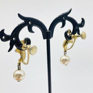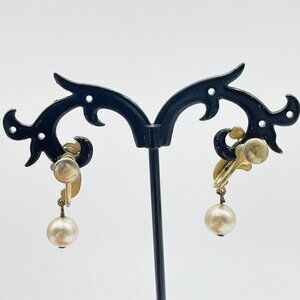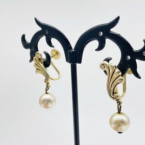 Fluted Scroll Pearl Drop Earrings Gold Tone Screw Back Classic Career Cosplay