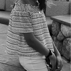 Flutter Sleeve Stripes & Arrows Top with elasticized shoulder that can be worn on or just off the shoulder. A soft lining underneath allows for modesty comfortable feel. Looks great worn casually with white or blue jean pants or shorts. This is not a crop top. It falls at the waist for an average size 10 year old girl. Size Large. Like new condition