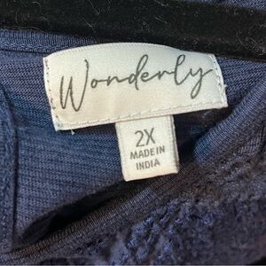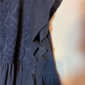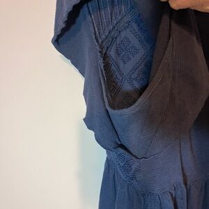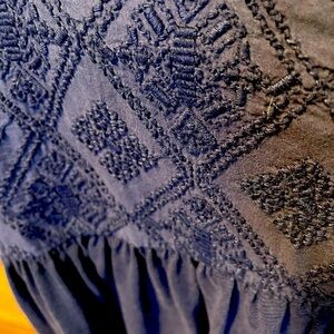 Wonderly blue cotton, linen, rayon blend With embroidered monochrome top, ruffle peplum bottom. Fitted top with flutter sleeves. Very good pre owned condition. Made in India.