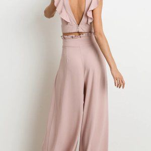 This two piece set features a light rose flutter sleeve top paired with a paper bag bottom. As beautiful as it looks, the fabric feels amazing. The breezy look makes a great stop and stare outfit. All brand new and never worn.