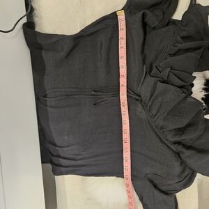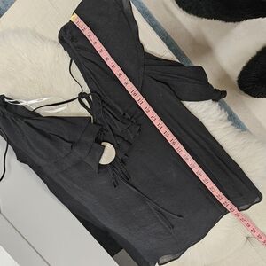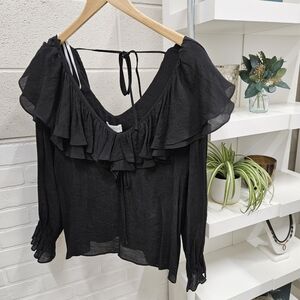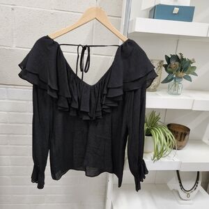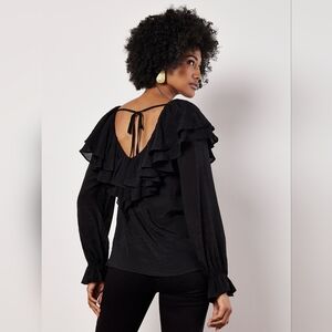 Longsleeve top with flutter at bustline and cuffs. Neckline is a v, at front and back with a tiered across the shoulders.