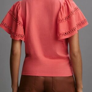 Elevate your style with this elegant coral blouse featuring delicate lace trim. Perfect for any occasion.