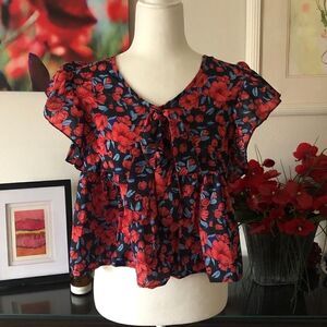 EUC Flutter sleeve Cropped top. Multicolor: Dark blue with red and light blue floral print. Brand: unknown but looks like some boutique brand. Tag size 6. Measurements: 17.5" across pit to pit, 21" long.