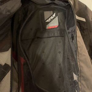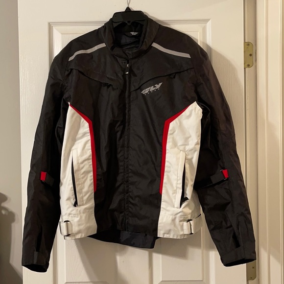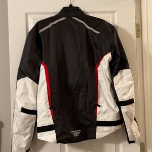 Fly Baseline riding jacket, size Large, has back foam and removable shoulder and elbow pads. Black, red and white.