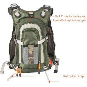 *This fly fishing backpack is equipped with all the storage you will need for your fishing trips including: 2 hard shell fly compartments, 8 general storage pockets and a 3 section extendable rear backpack!D-ring gear attachment on the back, accessory clasps with spring cords, rod holder loops & a variety of accessory loops to various tools .