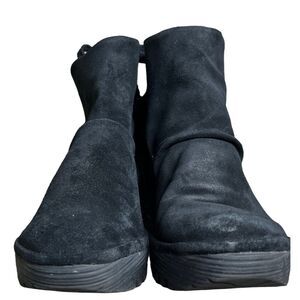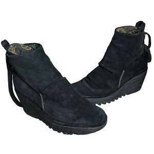 Fly London Ankle Boots Womens US 8 Black Yama Suede Ruched Wedge Lace Up Chic