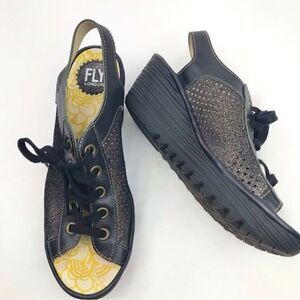 Fly London Black Metallic Perforated Leather Slingback Lace Up Chunky Wedges