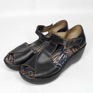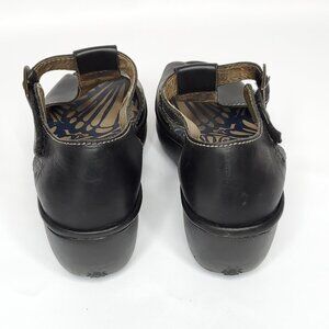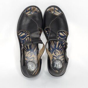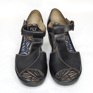 Fly London Black Sandal EU 39 US 8 8.5 Mary Jane Peep Toe Wedge T-Strap