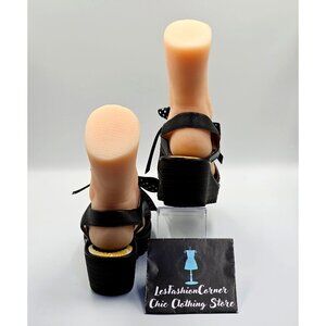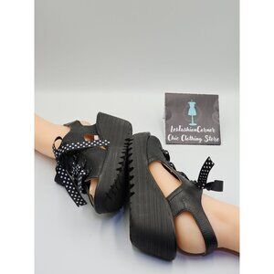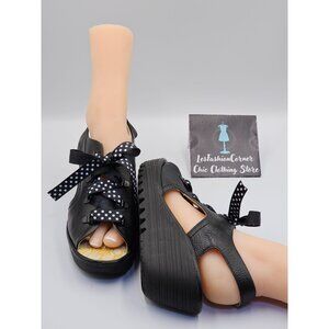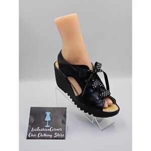 Stylish black wedges. Features polka dot bow detail. Comfortable and chic design.