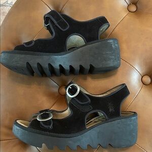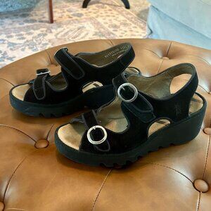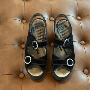 Fly London Black suede Bara style Buckle Sandals sz 38 EUC