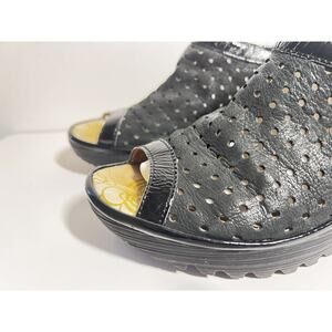 Fly London EUC Black Leather Yile Perforated Platform Wedge Sandal 8-8.5 US 39