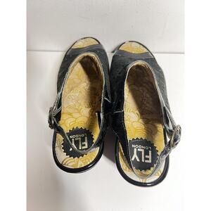 You are bidding on a pair of Yile sandals from Fly London, size 39 EU, 8-8.5 US, black leather with patent trim, excellent used condition. Adjustable buckle strap at ankle, 2.5" platform, perforated detail.