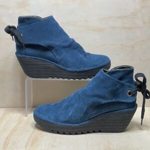Fly London Navy Blue Suede Wedge Ankle Boots Women 10 Shoes Lace Closure
