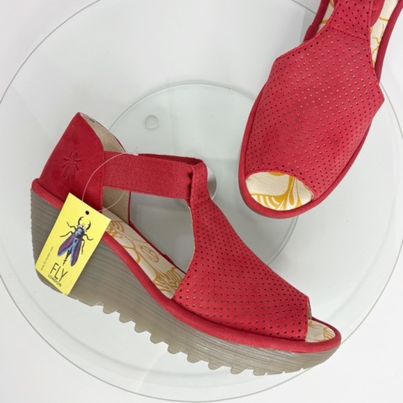 Fly London Wedge Sandal Red Pull On Elastic EU 38 US 7-7.5 Perforated Leather NWT