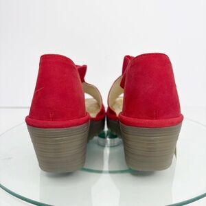 Fly London sandals, perforated leather wedges, red platform sandals, women’s size 7.5, EU 38 Fly London, summer dressy wedges, casual vacation sandals, comfort platform shoes, Fly London open toe, suede