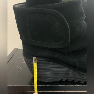 This is a listing for a pair of preowned Fly London Size 37 Booties Suede Wrap Around Wedge Heel Short Black Boots US 6. The condition is good, light wear on suede and bottoms, I have not tried cleaning the suede. Please see all photos for details as they are part of the description.
