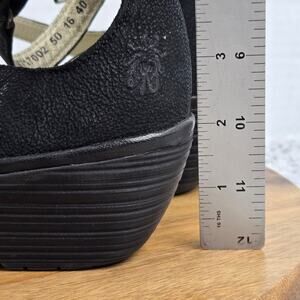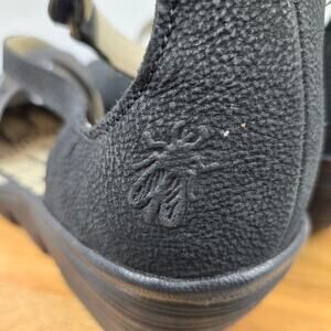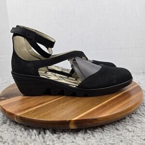 Fly London Women 40 Pele Black Leather Ankle Strap Casual Lifestyle Wedge Sandal