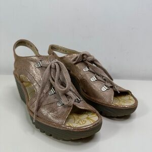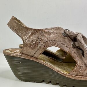 Fly London YLFA Wedge Sandals Metallic Leather Tan Beige Pearl Lace Open Toe 39