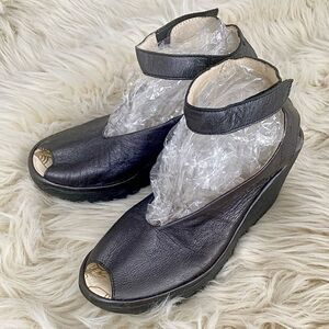 Fly London Yala Black Leather Peep Toe Wedge Sandals Ankle Strap 9-9.5 Boho Emo
