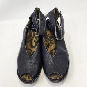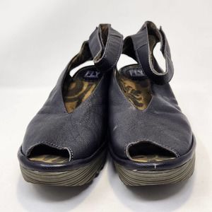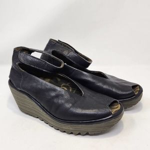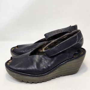 Fly London Yala Black Leather Peep Toe Wedge Shoe Womens 38 US 7.5 Ankle Strap
