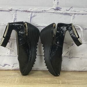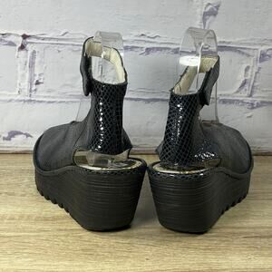 Fly London Yala Black Snake Leather Wedge Sandals Women's Size 36 Ankle Strap