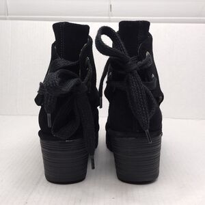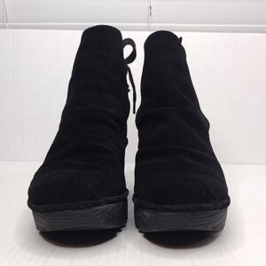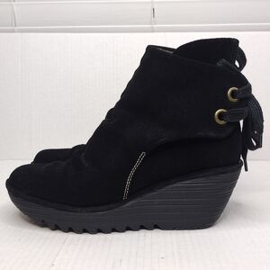 Fly London Yama women's black suede back tie up heel wedge platforms size 8.