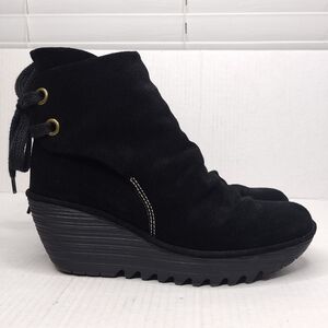 Fly London Yama Women's Black Suede Back Tie Up Heel Wedge Platforms Size 8