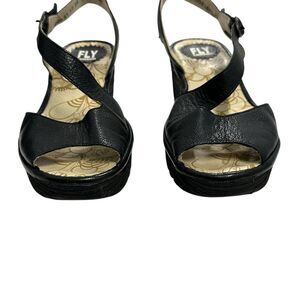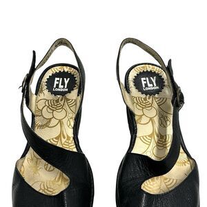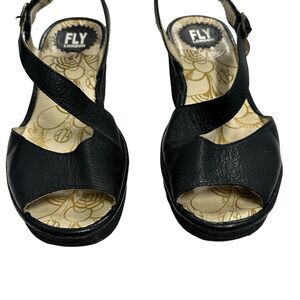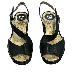 Fly London Yamp Leather Cut Out Wedge Heel Peep Toe Black Sandal Size 38