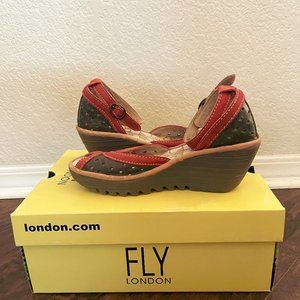 Fly London Ydel Black/Red Perforated Leather Peep Toe Wedges Size 36