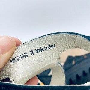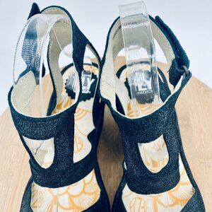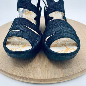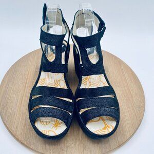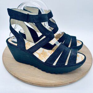Fly London Yeba Sandals Womens 7.5 38 Black Leather Strappy Wedge Peep Shiny