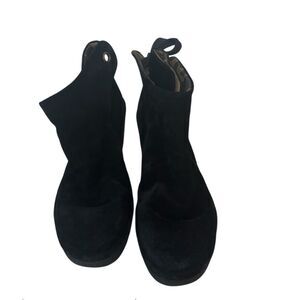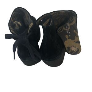 These are preowned black suede ankle booties by Fly London. The booties have a lug sole and a lace up back. They have one manufacturer lace but the other is missing. They were removed to be worn with ribbons at the heel instead of the laces and one lace was misplaced. No other flaws.