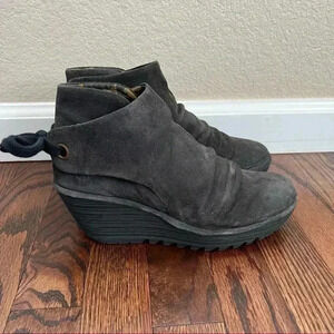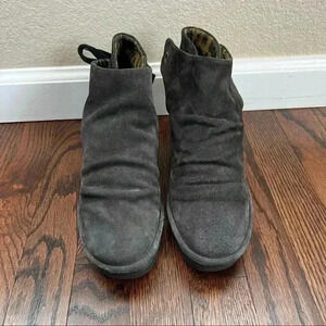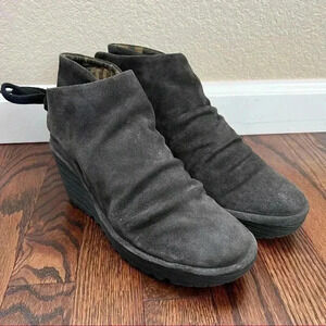Fly London Yebi Suede Wedge Gray Ankle Boot Shoes Size 39, 8-8.5 Pre-owned condition, worn on soles, worn on leather, missing boot laces left boot, pictures provided.