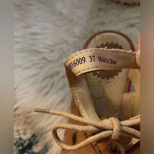 Tan suede ghillie tie lace up wedge sandals white ripple soles with 2.5” heel and 1” platform