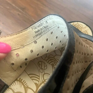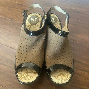 This is lightly used pair of Fly London sandals on good to excellent condition. There are no flaws. The colors are tan with black patent leather trim. This is a sling back sandal and the heel height graduates from about 2 to 2.9 inches. All of my items come from a smoke free home. Considerate offers welcome.