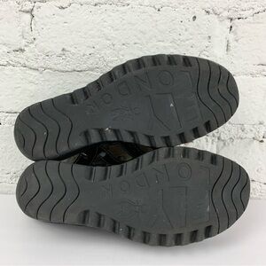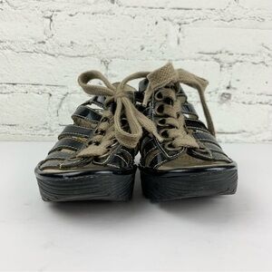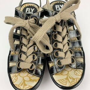 EUC black patent leather laced front platform wedge Yito sandals by Fly London in a size EU 36. In excellent used condition. Please see all photos for details.