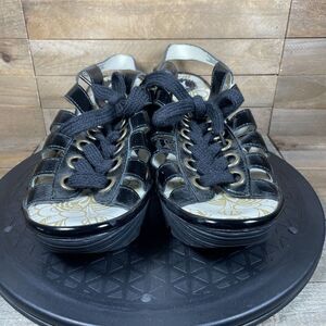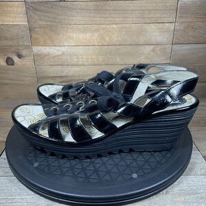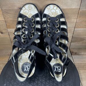Fly London Yito Black Leather Wedge Strappy Sandals Lace Up EU 41 US 10
