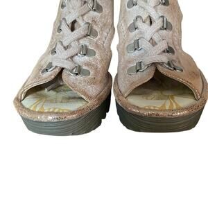 Fly London Ylfa Gold Metallic Leather Lace Up Wedge Shoes size 35 US 5 in excellent condition- no box. More metallic looking in person - camera didn’t catch shine. Heel height 2 1/2 inches