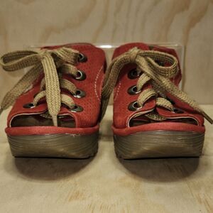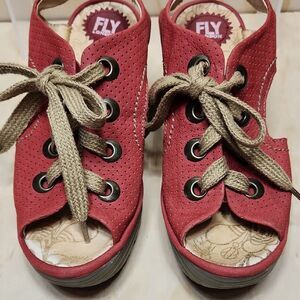 Fly London Ylfa Red Tan Wedge Sandals Women 11 US 42EU Laces 2.5" Heel Open Toe
