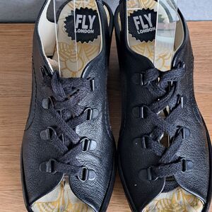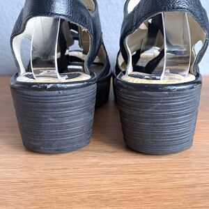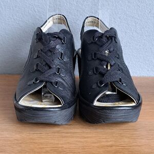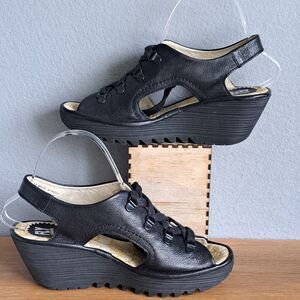 Fly London Ylfa Women’s 8.5 39 Black Leather Lace-Up Platform Wedge Sandals