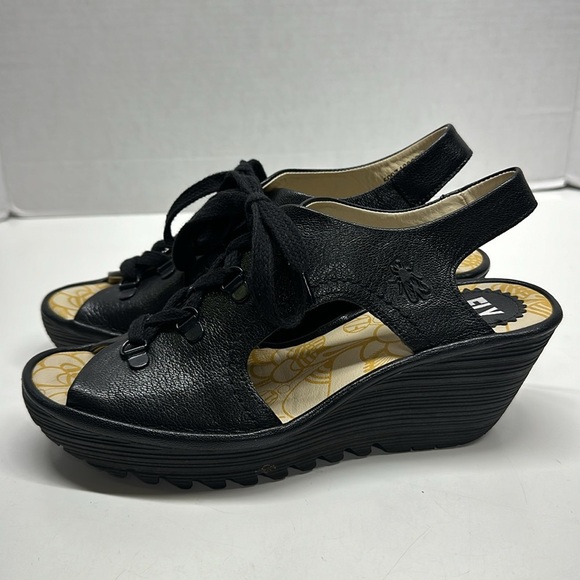 Fly London Ylva High Heel Wedges Wedged Sandals Open Toe Leather Black Size 39 / US 8 8.-5 * Size chart in photos.