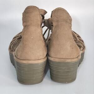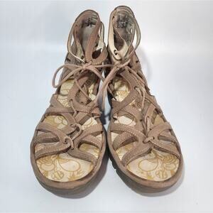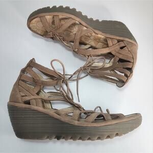 Tan leather Yuke gladiator sandals from Fly London. Laced up the whole shoe. There is some wear on the footbed toe area as shown in the last photo. 2 1/2" heel includes 1" platform