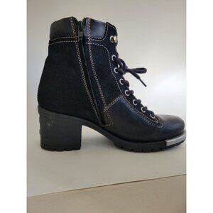 Fly London black Leal leather Suede Combat Ankle Boots size 8 38 Moto block heel
