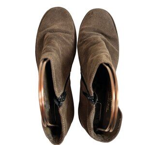 Fly London Wezo booties, short ankle shaft, brown-taupe suede, round toe, ruched / scrunched, 2" block heel, rubber soles, zip up, EU 40 / US women's 9 - 9.5, preowned and shows wear on the soles, worn suede - see photos
