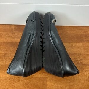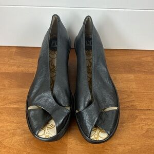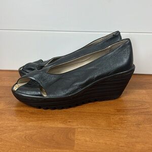 Fly London criss cross peep toe metallic black 2.5” wedge size 39