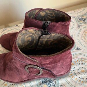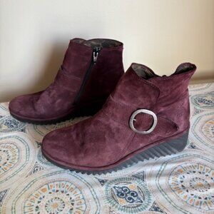 Fly London suede wedge ankle boots. Burgundy suede with distressed metal buckles, black rubber sole. Inside zippers. Wedge 1/2" to approx 2' heel. Size 38.